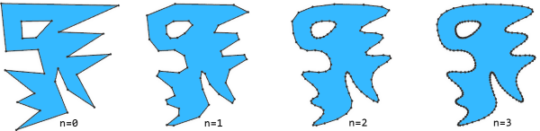 This example implements Chaikin's corner cutting algorithm to smooth the polygon boundary. Each iteration splits every edge into three parts and collapses the last segment. By collapsing the end of each edge, the start of the following edge is also collapsed, gradually cutting the corners and producing an even smoothing effect. The cleanupGeometry operation merges the vertices of the collapsed edge. |